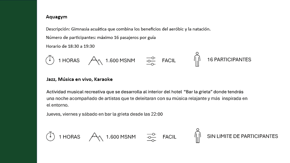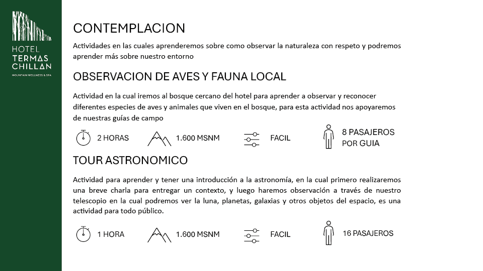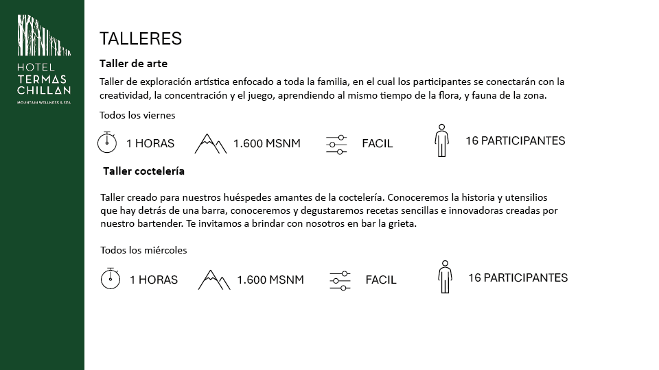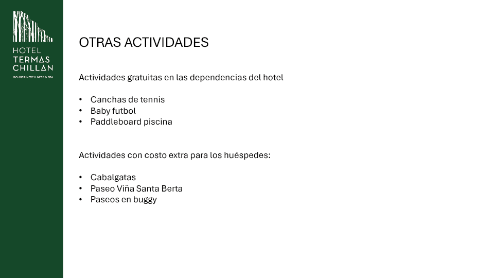 *Las caminatas full day ( Aguas calientes y Laguna el huemul ) serán realizadas por un tour operador externo, con cobro extra al pasajero.