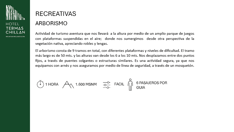 ¡Una aventura aérea inolvidable! Explora nuestro parque de 9 tramos con diferentes niveles de dificultad. Deslízate por cables de hasta 50 metros de largo a través de bosques nativos, admirando robles y lengas. Todo el equipo de seguridad está incluido para que disfrutes al máximo de esta experiencia única.