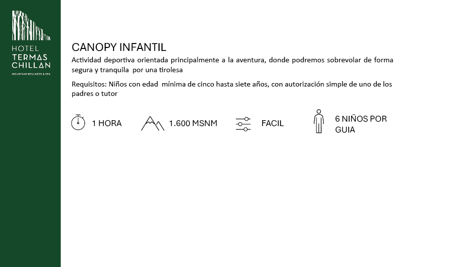 Disfruta de una aventura aérea inolvidable en nuestro parque de tirolesas. Los más pequeños (de 5 a 7 años) podrán deslizarse por el aire con total seguridad, acompañados por nuestros guías expertos.