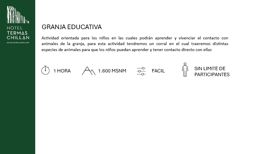 Los más pequeños podrán vivir una experiencia inolvidable conociendo de cerca a nuestros animalitos. En nuestro corral, los niños aprenderán sobre diferentes especies y disfrutarán de un contacto directo con ellos. ¡Una aventura educativa que no se olvidarán!