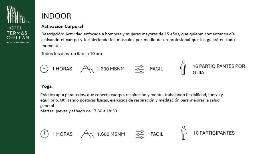 Activa tu cuerpo con nuestras clases de activación física y yoga. Refuerza tus músculos y encuentra tu equilibrio interior. Y por las noches, relájate con música en vivo en nuestro bar. ¡Todas las edades son bienvenidas!