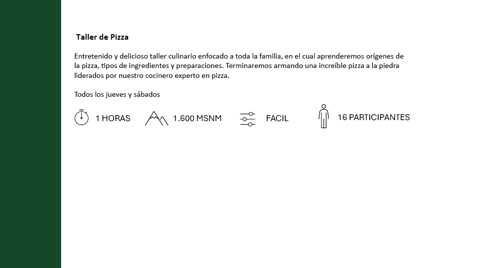 Sumérgete en el mundo de la pizza y aprende a preparar tus propias creaciones. ¡Te esperamos todos los jueves y sábados para disfrutar de una tarde llena de sabor!