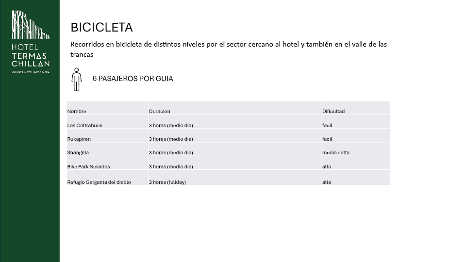 Explora el increíble entorno del Hotel Termas Chillán en emocionantes rutas en bicicleta. Desde paseos fáciles en Los Coltrahues hasta desafíos en el Bike Park Nevados, hay opciones para todos los niveles. Rodéate de bosques nativos, avifauna y espectaculares paisajes montañosos en cada recorrido.