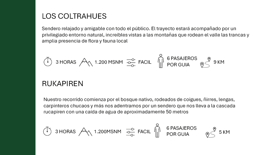 Vive la conexión con la naturaleza en caminatas inolvidables. Desde rutas cortas como Gruta Los Pangues hasta desafíos como Laguna El Huemul, disfruta de paisajes únicos con bosques nativos, vistas volcánicas y aguas termales. Todas las caminatas incluyen snack y agua para un día lleno de energía y descubrimiento.