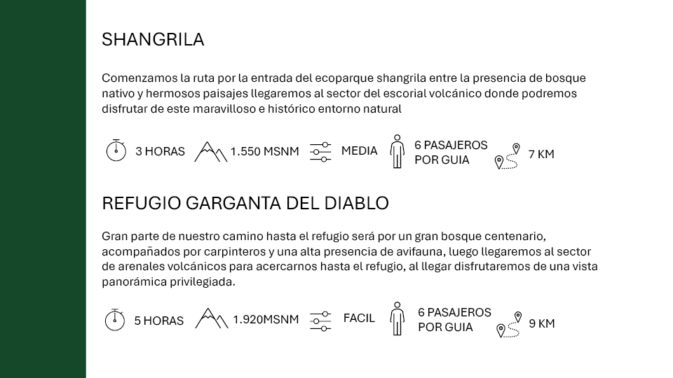 Nos dirigiremos en auto hasta la entrada del ecoparque Shangrila, en este punto comenzamos nuestra actividad en la cual podremos contemplar el bosque nativo y el escorial de lava producto de antiguas erupciones del volcán.